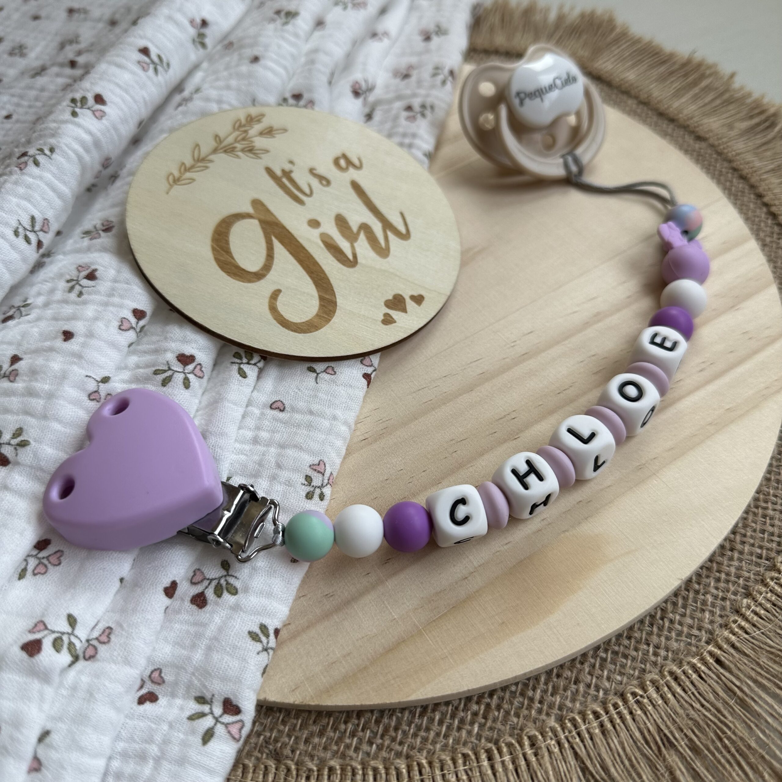 Nuestro chupetero de silicona personalizado está diseñado para mantener el chupete siempre cerca, de forma segura y con mucho estilo. Hecho a mano con cuentas de silicona alimentaria, suave al tacto y libre de BPA, es ideal para las manitas curiosas y las encías en plena exploración.