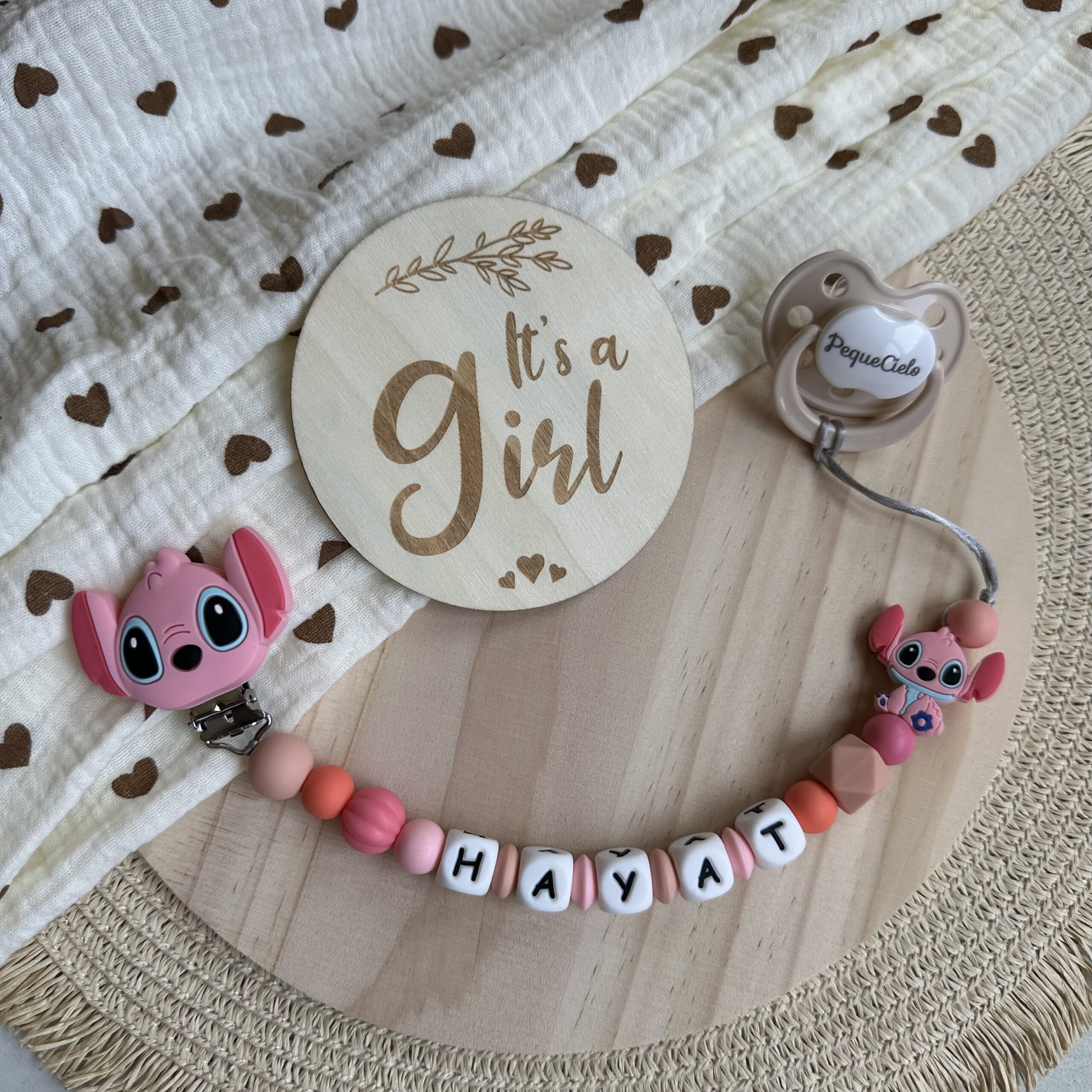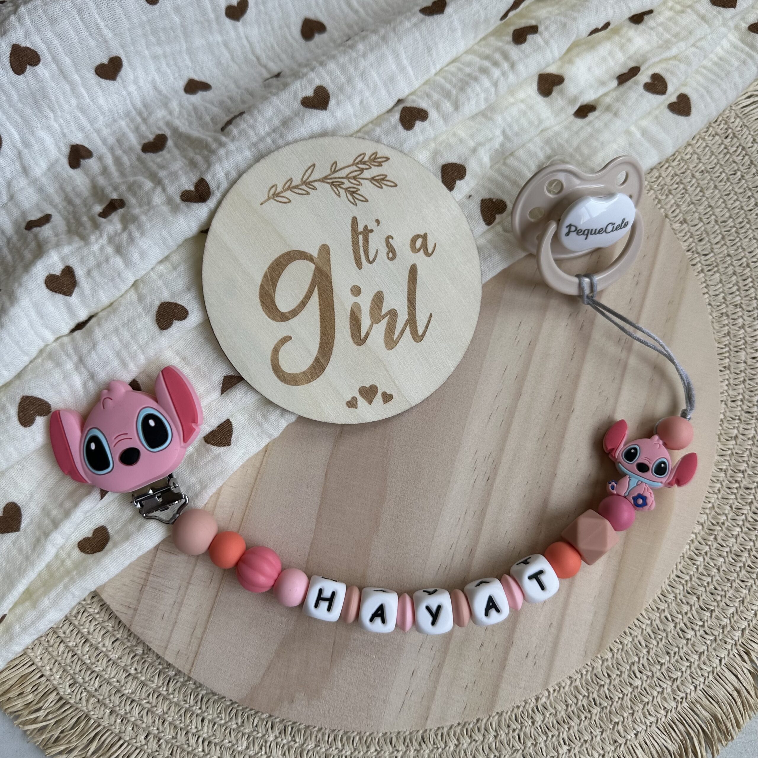 Diseñado con dulzura, este chupetero en tonos rosas y coral suaves transmite ternura, calma y alegría.