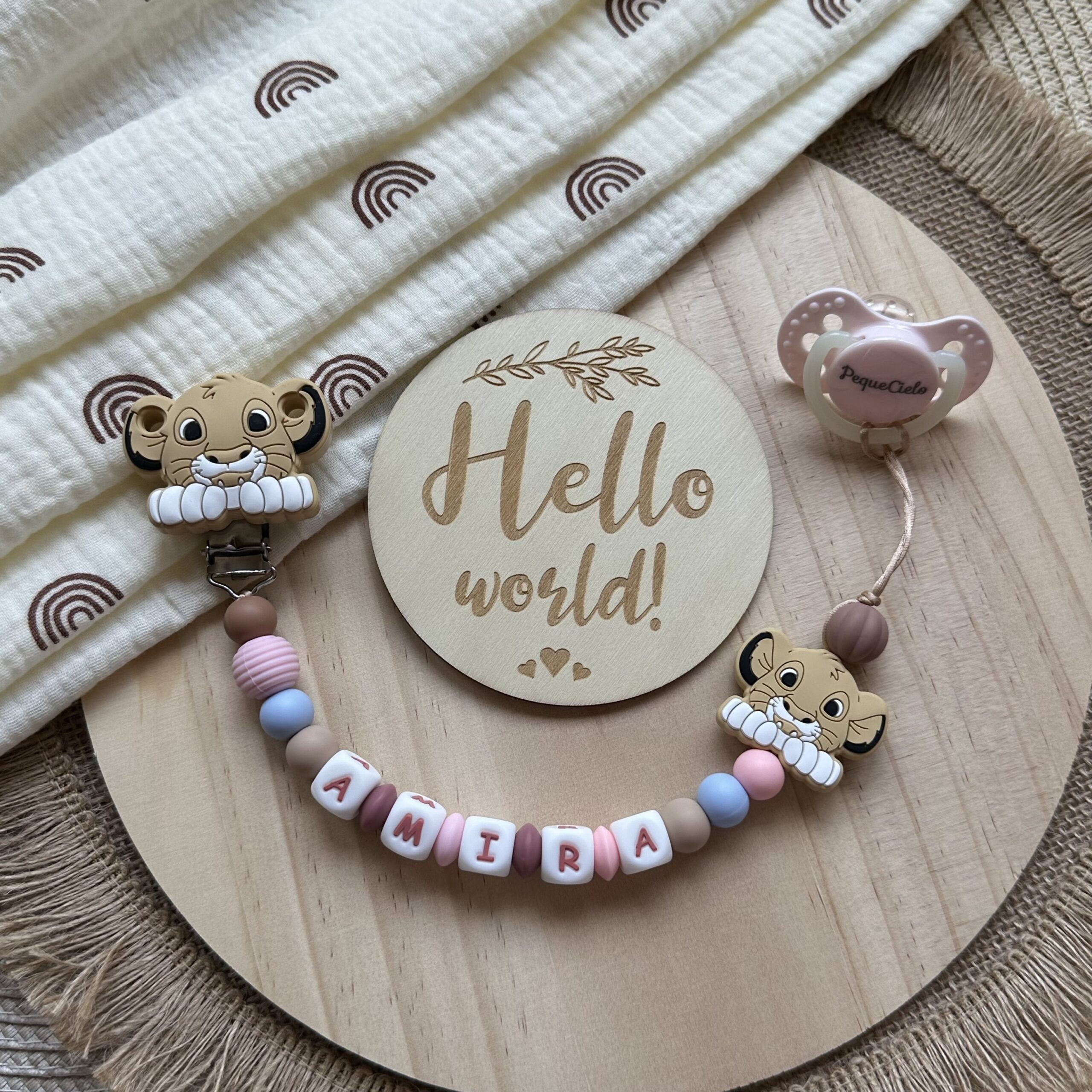 👶 Cada bebé merece un detalle único y lleno de amor. Haz que cada detalle cuente con este chupetero personalizado con el nombre del peque y el adorable diseño de “Simba”.