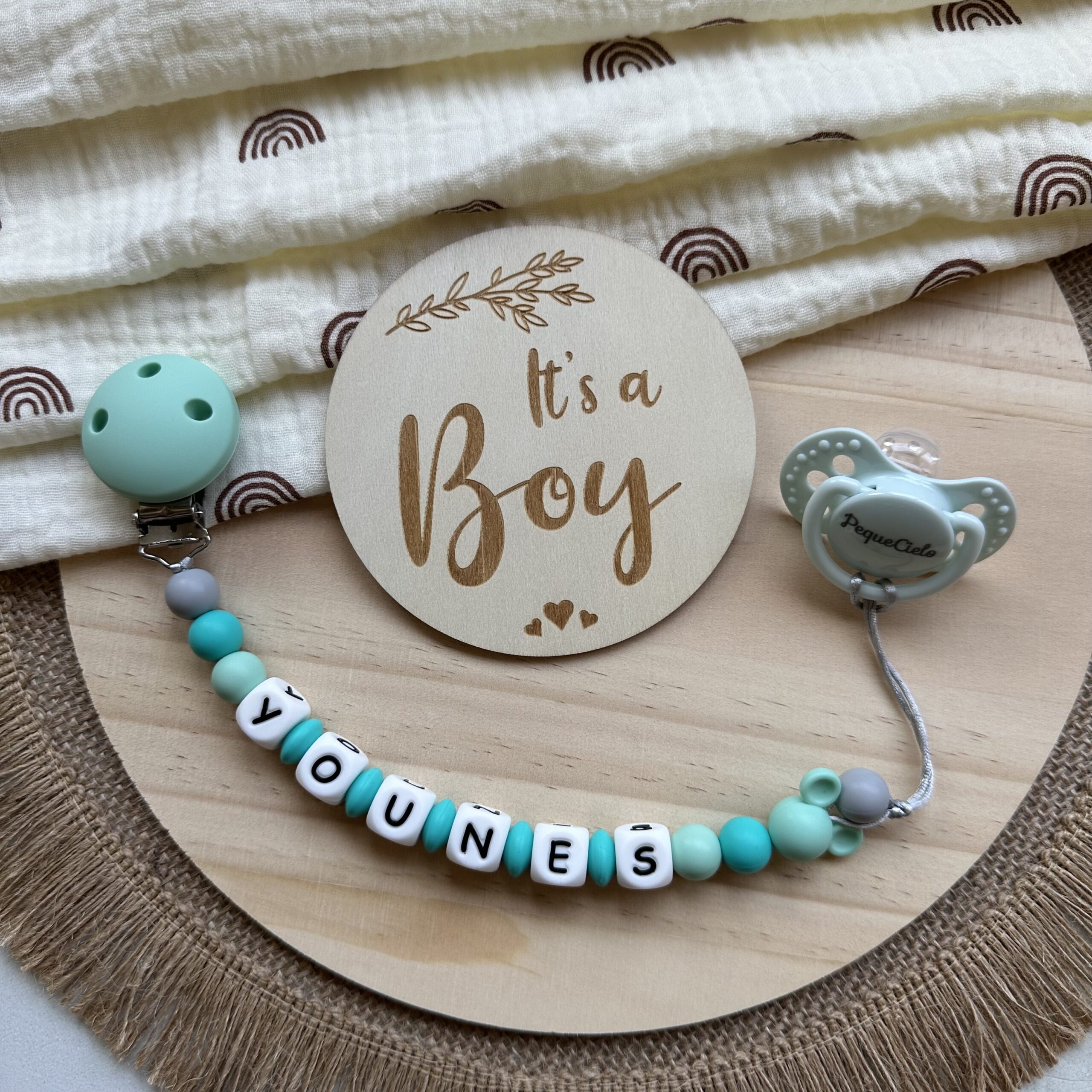👶Nuestro chupetero personalizado en tonos verde mint está diseñado para mantener el chupete cerca, de forma segura y con mucho estilo.