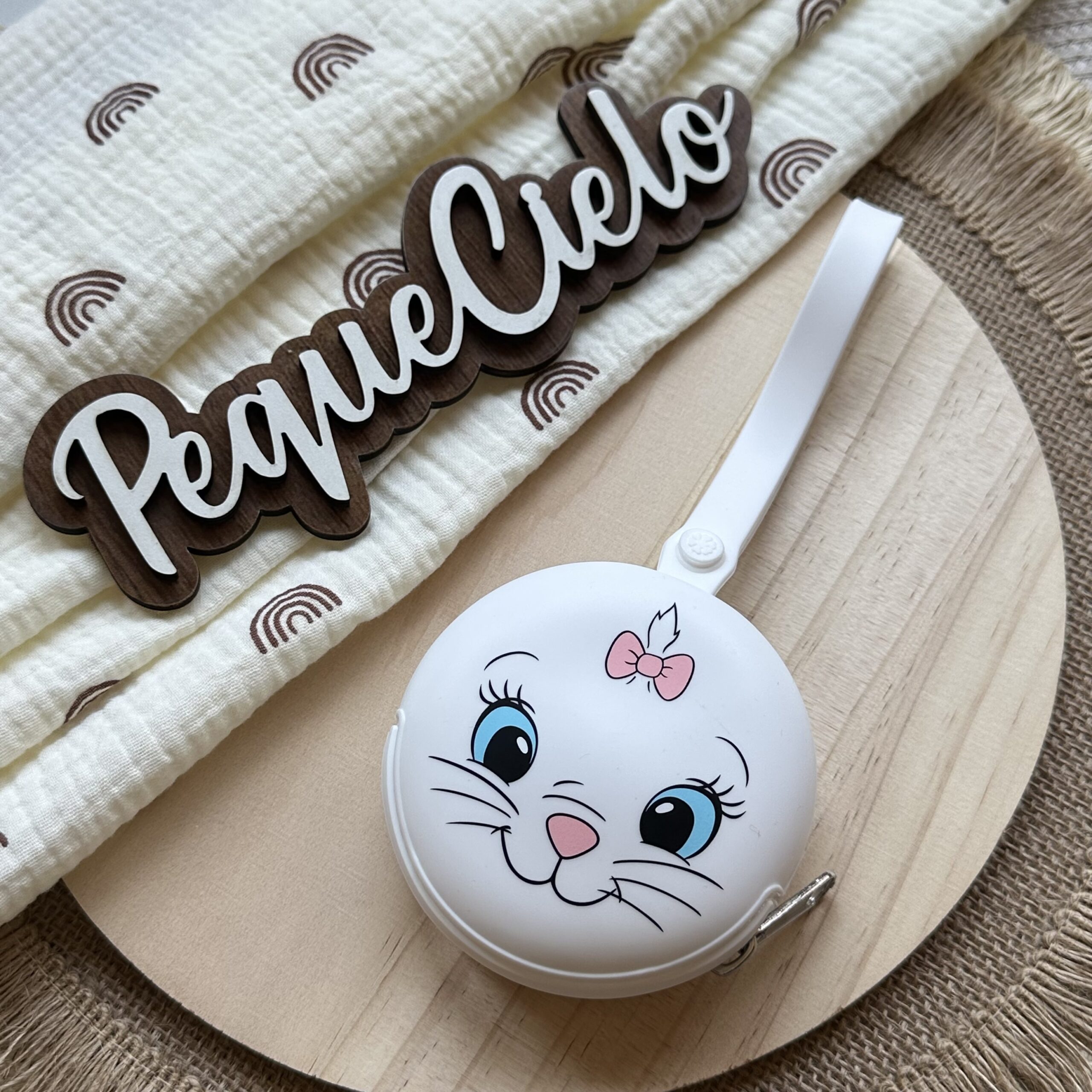 Nuestro guarda chupete con diseño de la cara de la tierna gatita Marie será ideal para llevar el chupete de tu peque guardado, limpio y seguro.