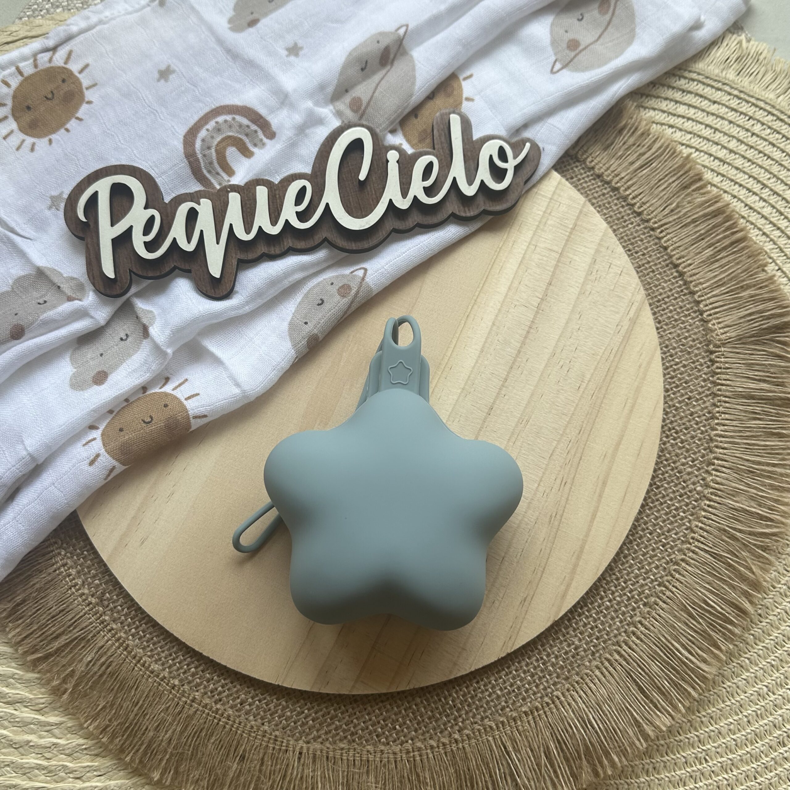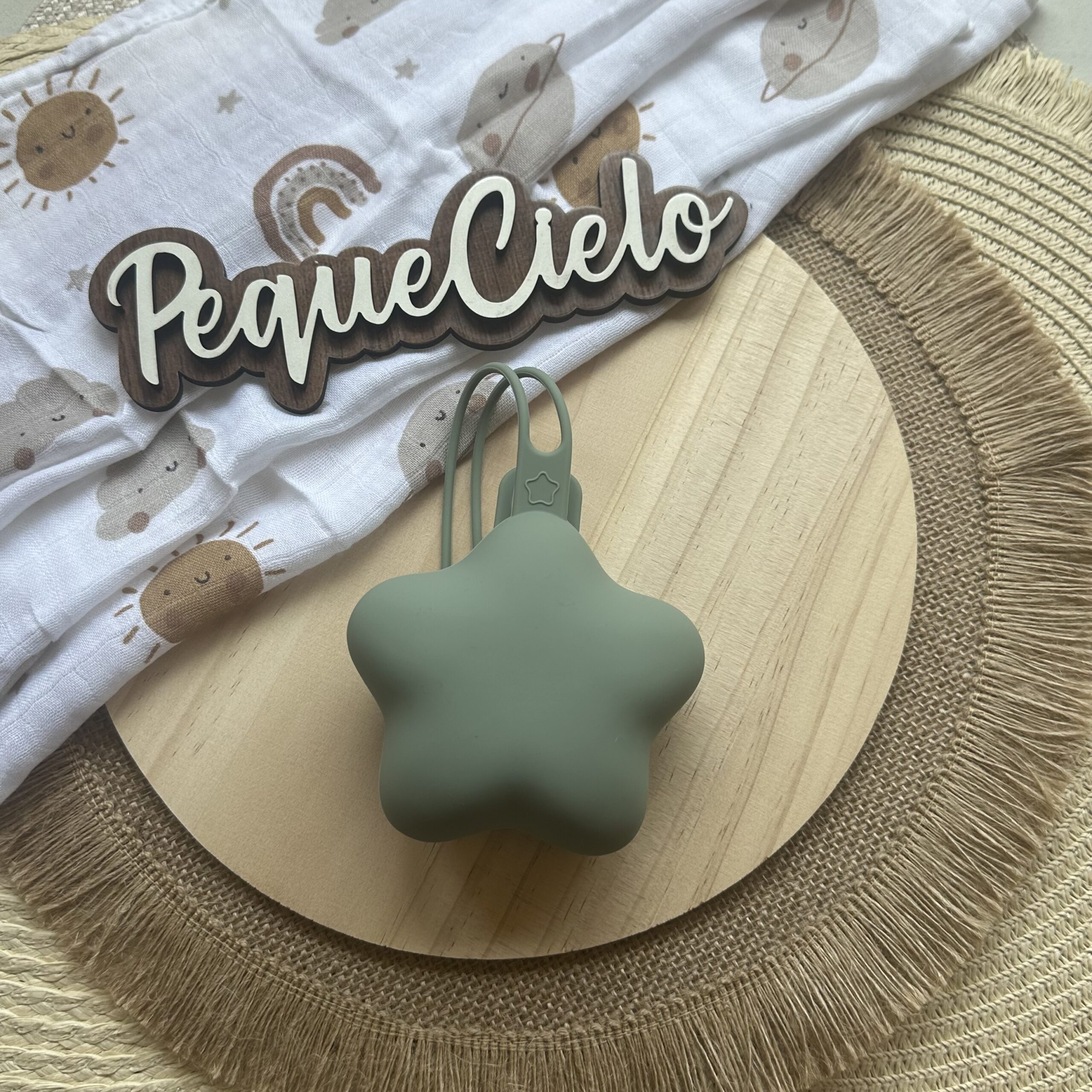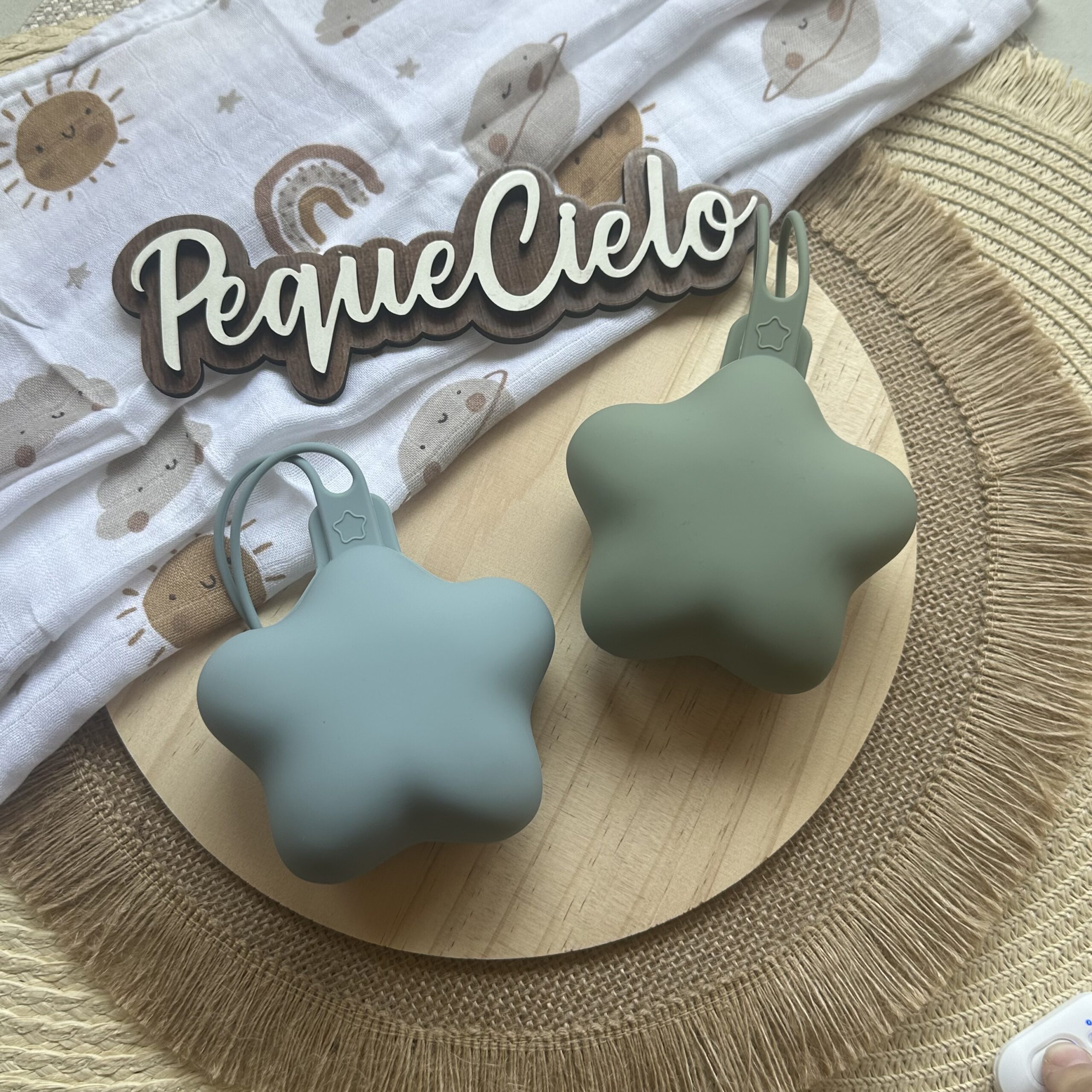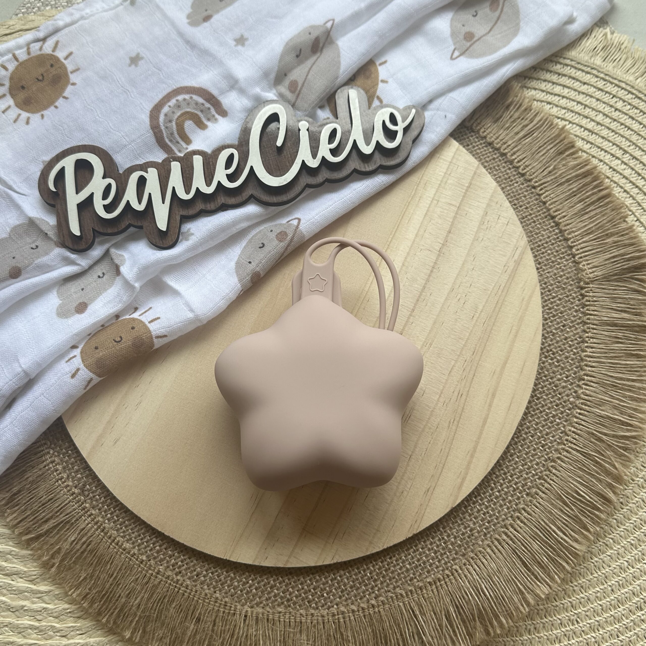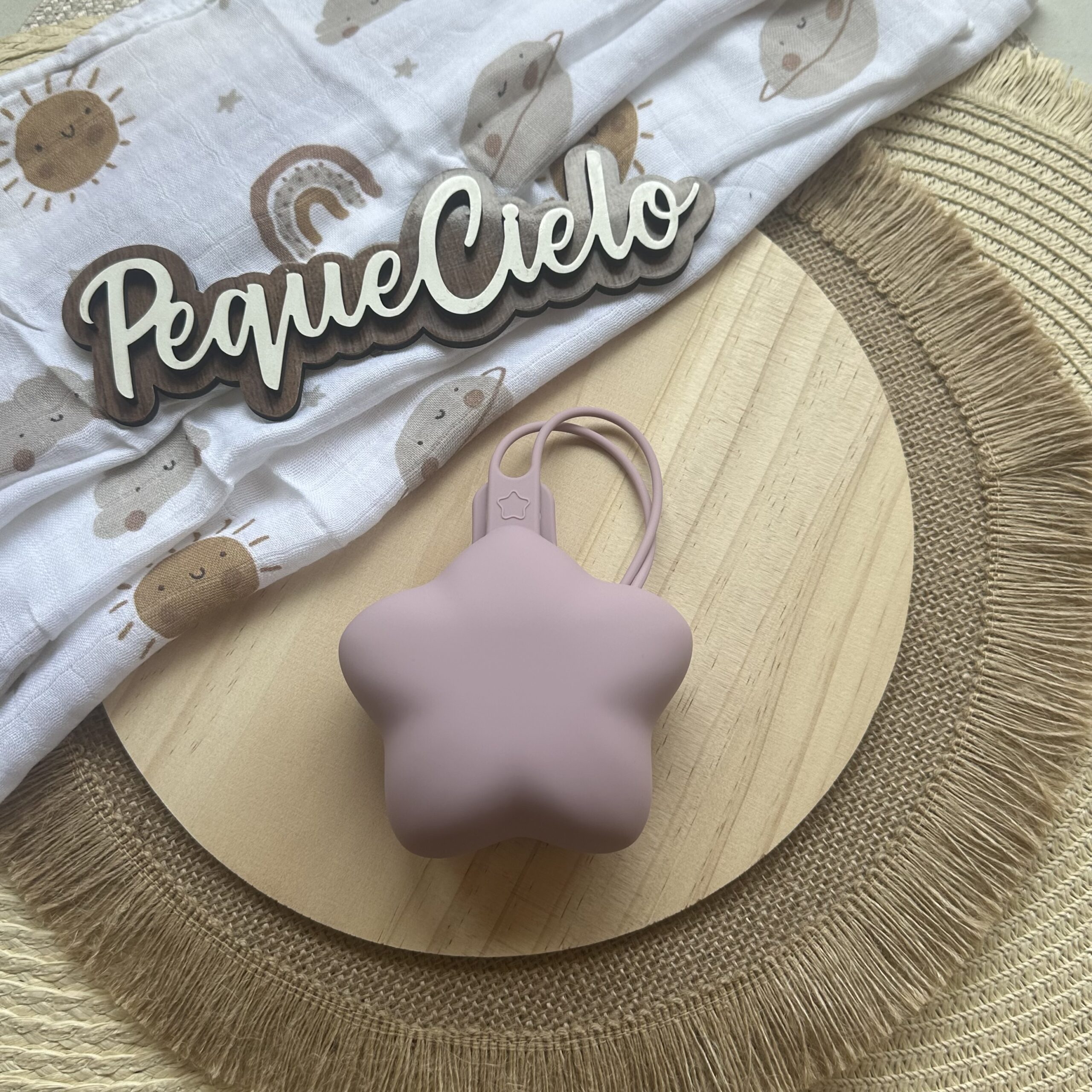 Nuestro guarda chupete de silicona en forma de estrella es el complemento ideal para llevar el chupete de forma limpia, segura y con mucho estilo.