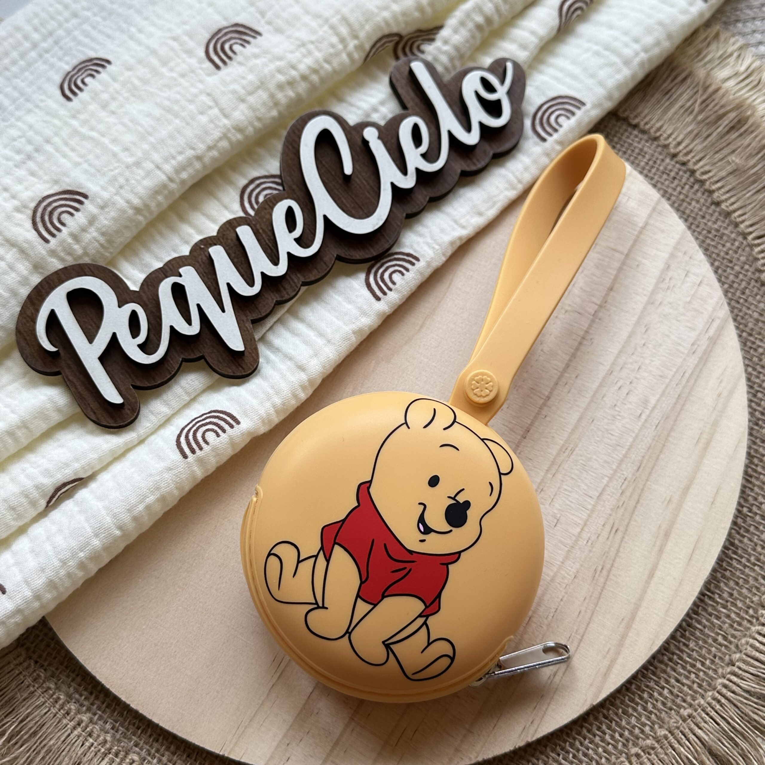 Este guardachupete de silicona con cremallera está inspirado en el tierno Winnie the Pooh, ideal para guardar el chupete de tu bebé de forma segura y con mucho estilo.