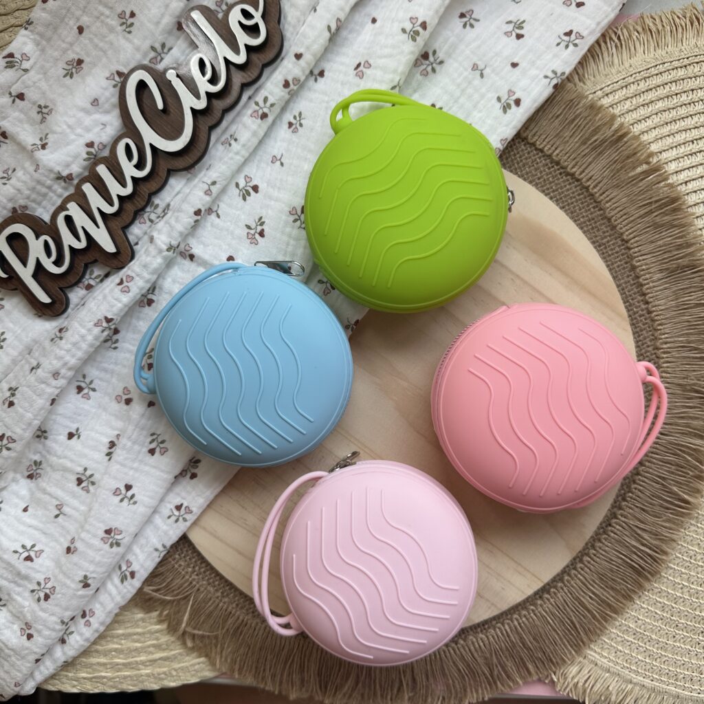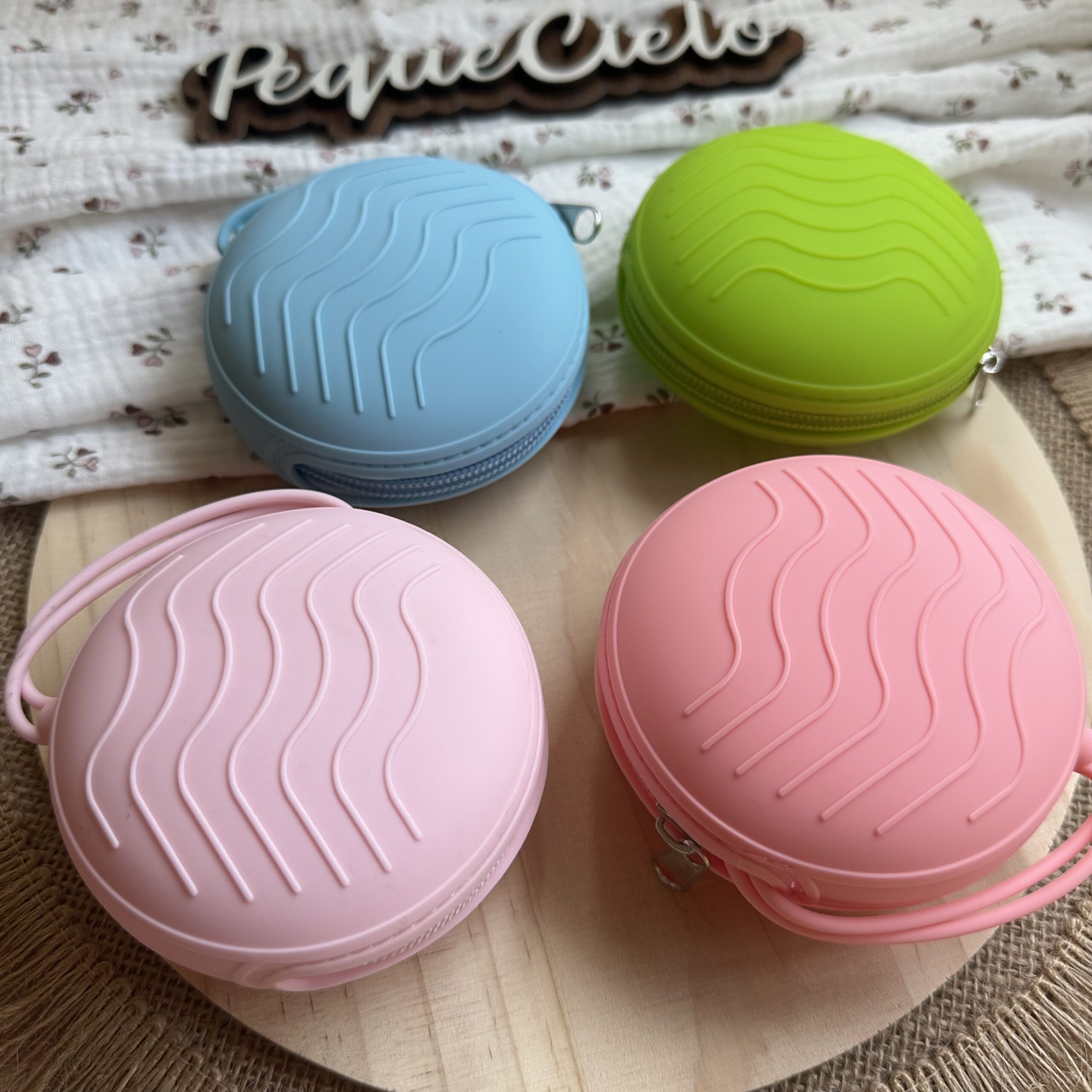 Este guarda chupete redondo de silicona con cremallera y cuerda será el complemento ideal para llevar bien protegido el chupete del peque.