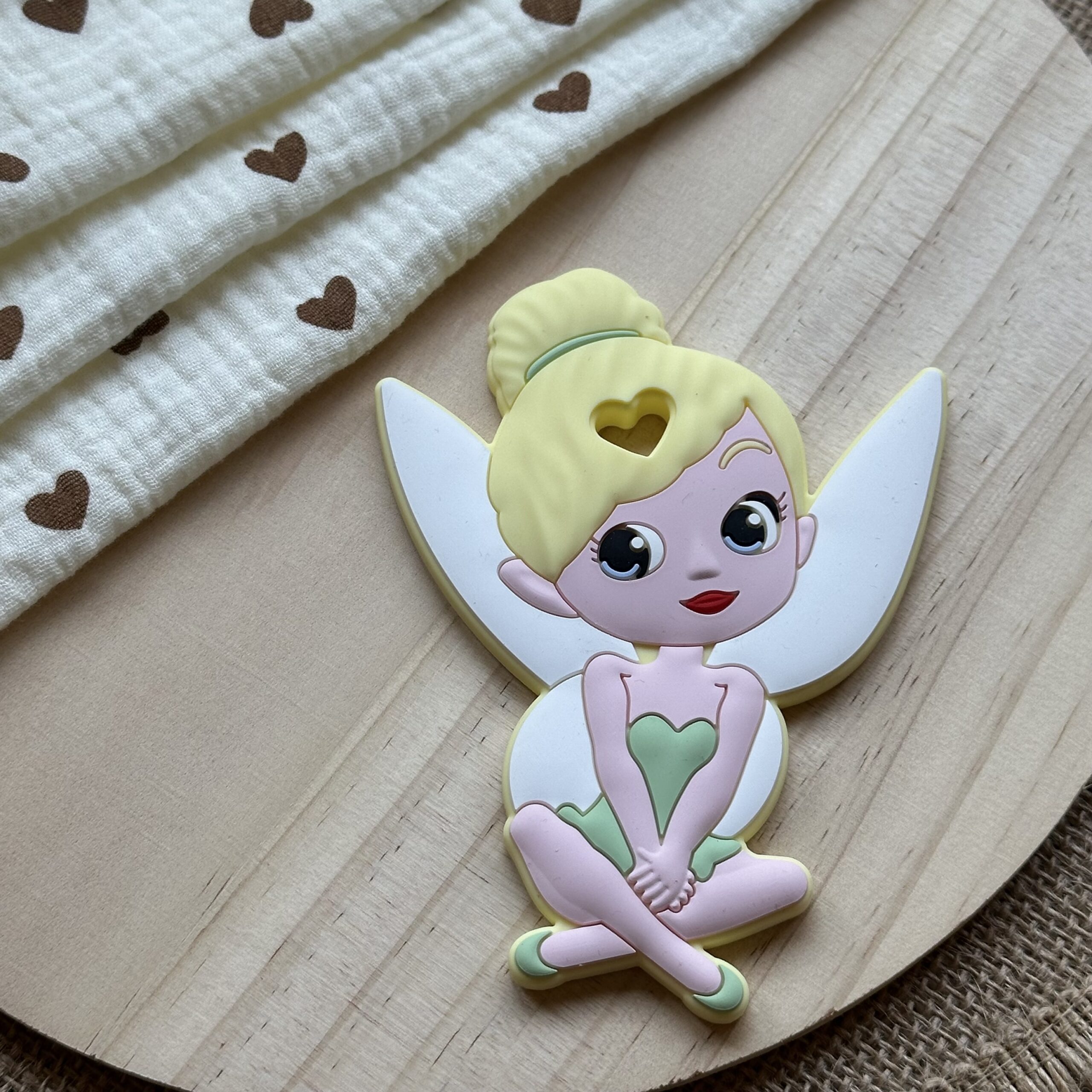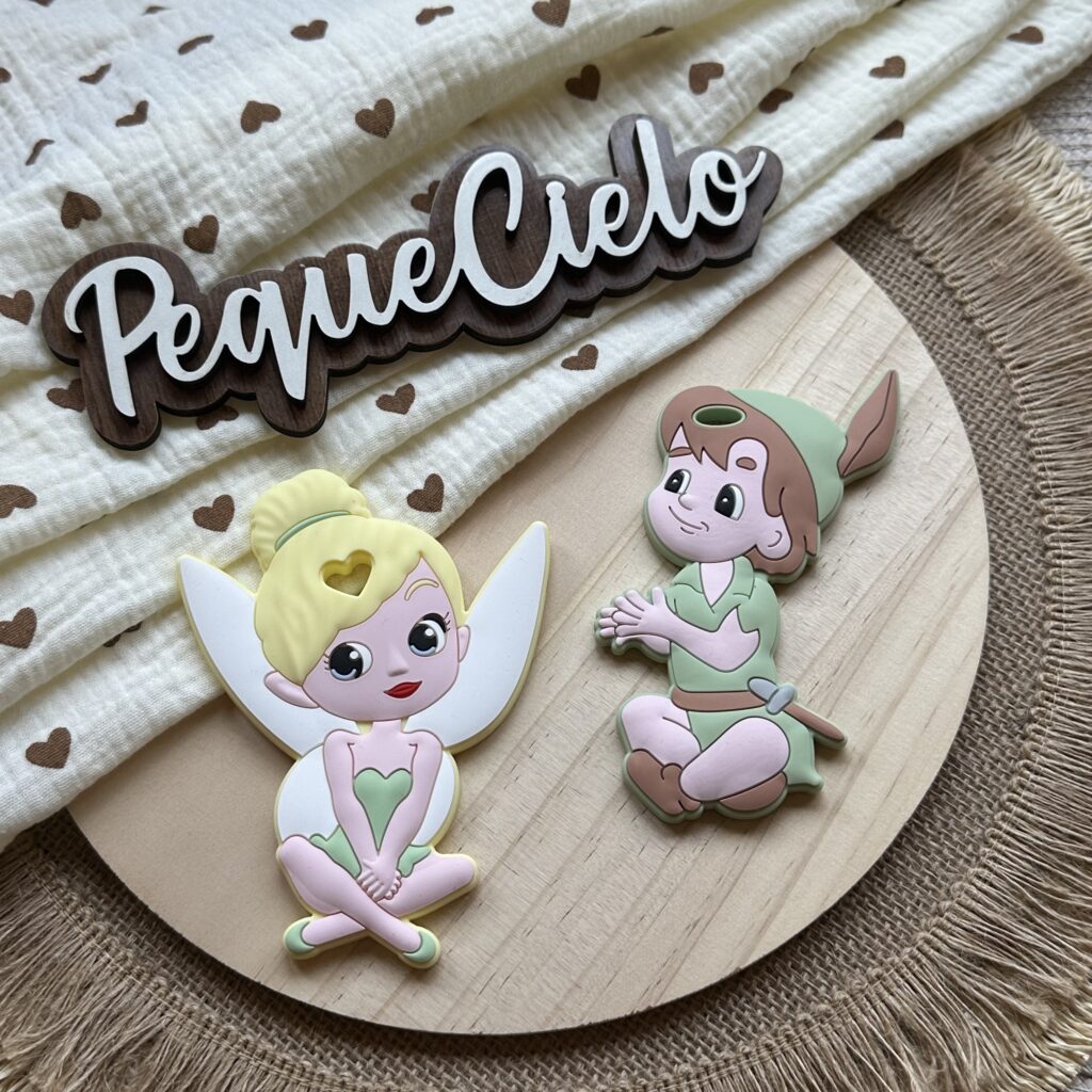 Este encantador mordedor de silicona inspirado en Peter Pan y Campanilla está pensado para acompañar a tu bebé en su propia aventura de crecer, con un toque de fantasía y dulzura.