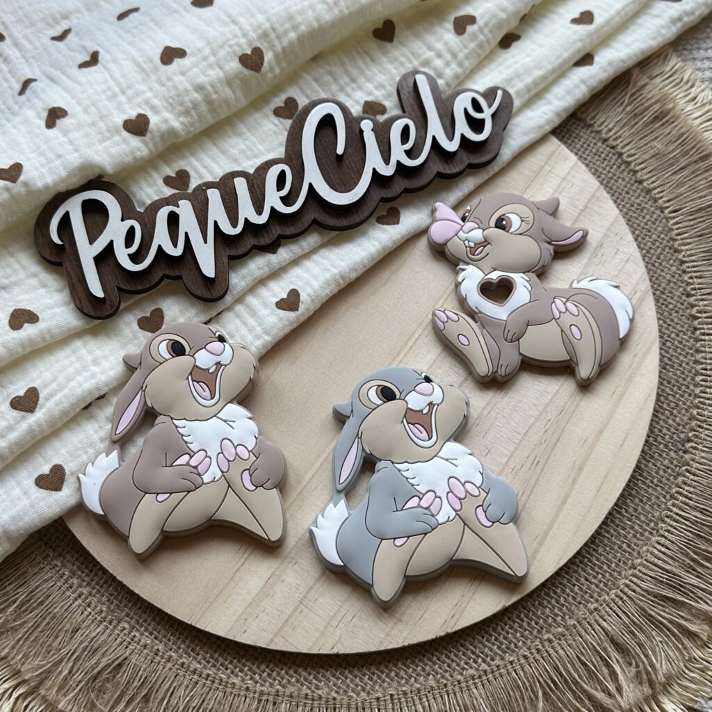 Inspirado en Miss Bunny y Tambor, este mordedor de silicona combina suavidad y diseño tierno. Perfecto para pequeñas manos y encías sensibles, con un aire encantador y delicado.