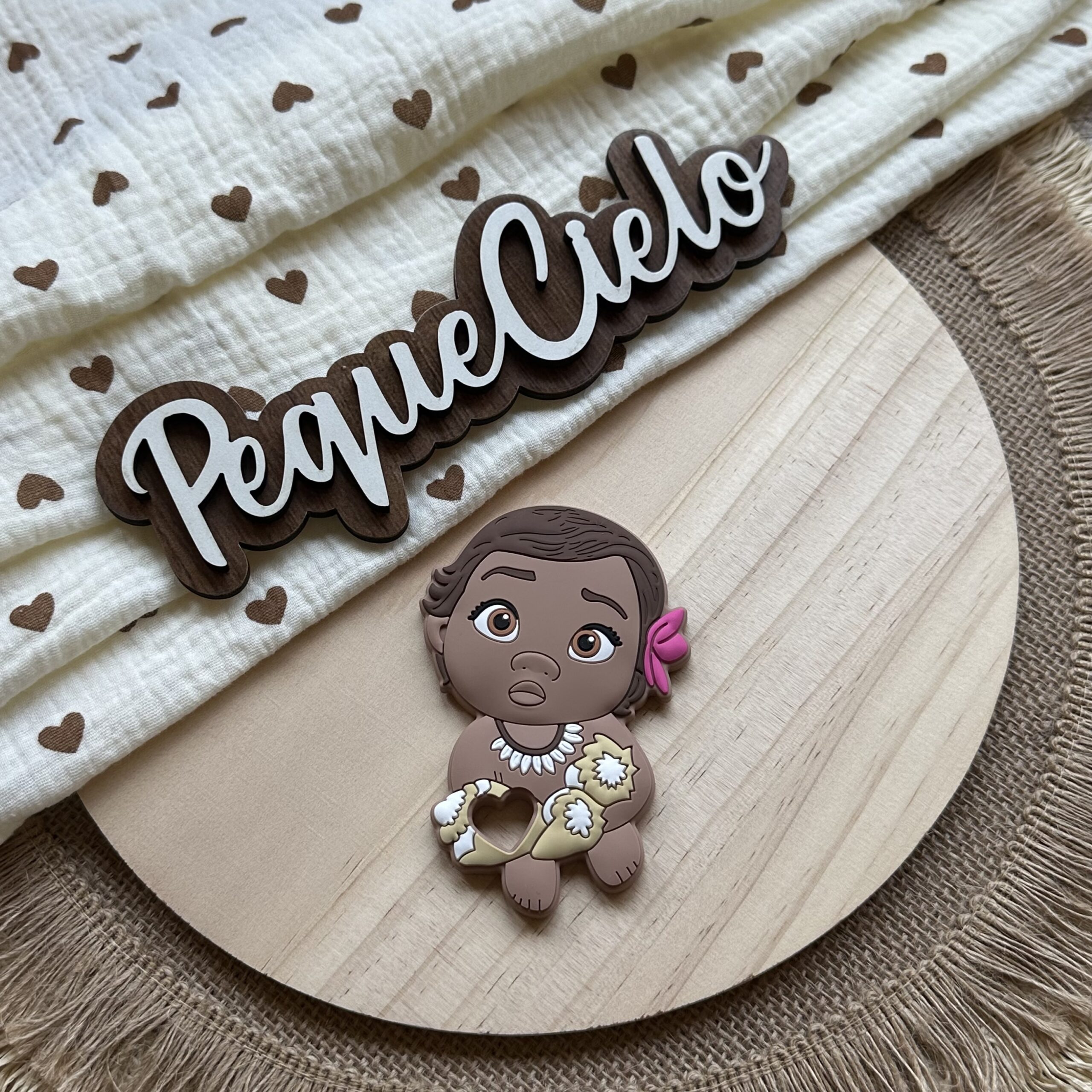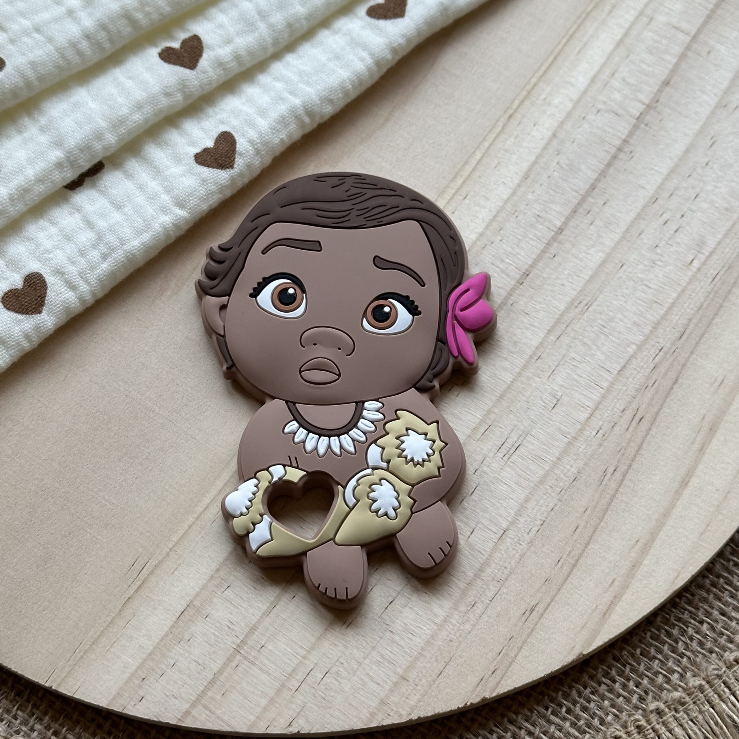 Este mordedor inspirado en Moana bebé es perfecto para los pequeños exploradores. Fabricado en silicona alimentaria, suave y segura, acompaña a tu peque en sus primeras aventuras.