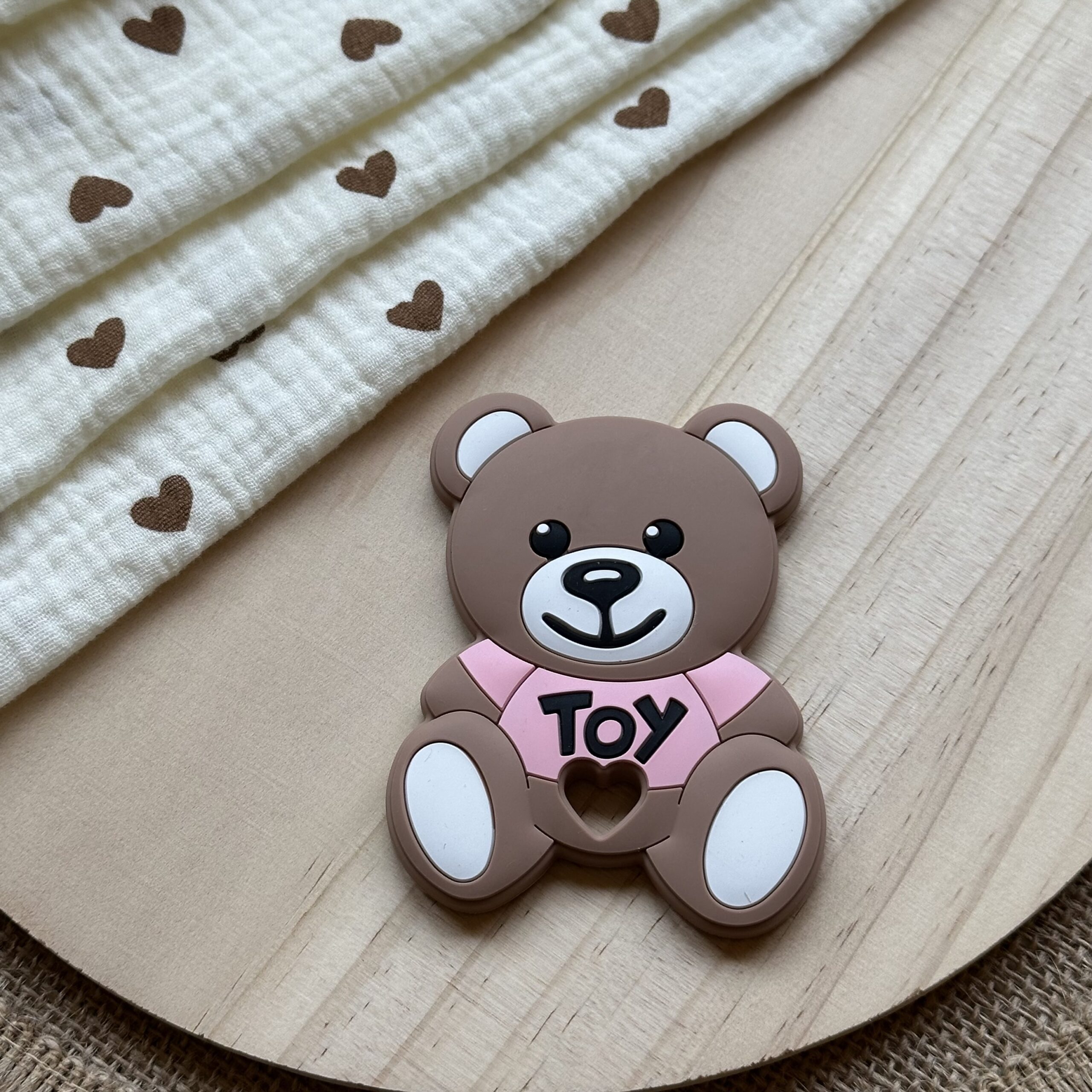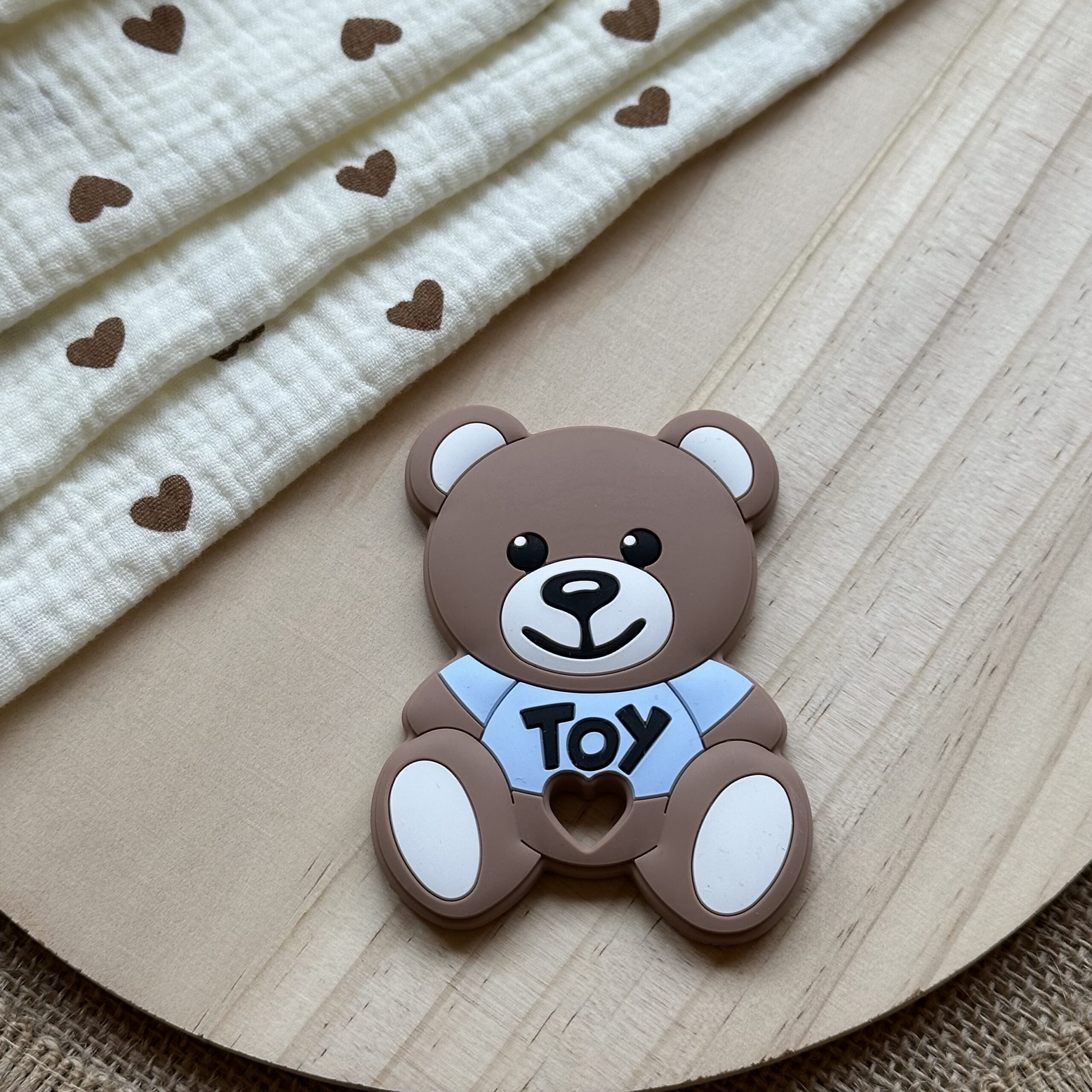 Nuestro mordedor inspirado al osito de Moschino está disponible en: Marrón-Azul, Marrón-Gris y Marrón-Rosa.