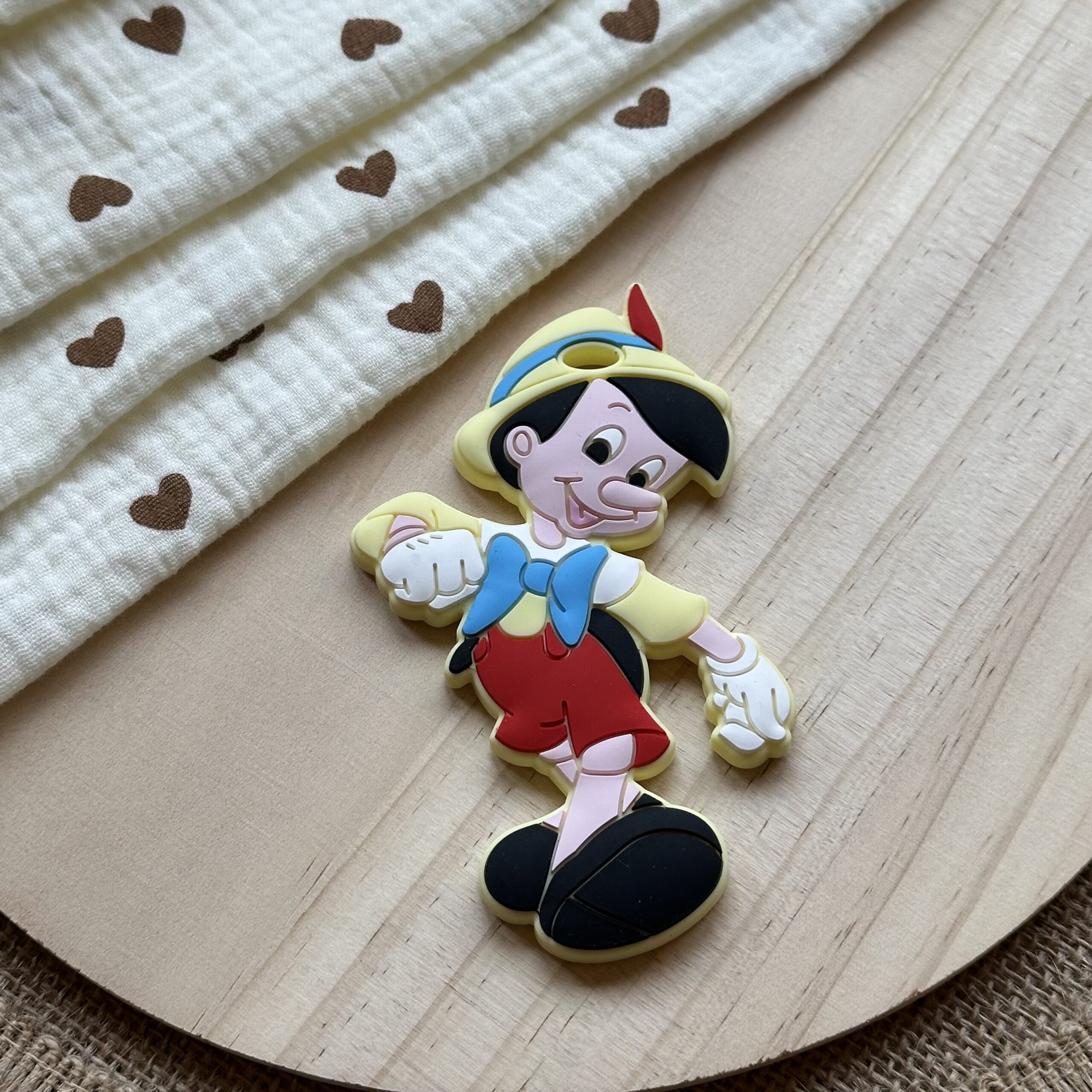 Inspirado en el entrañable Pinocho, este diseño tierno está hecho de silicona segura y suave, ideal para acompañar a tu peque mientras descubre el mundo.