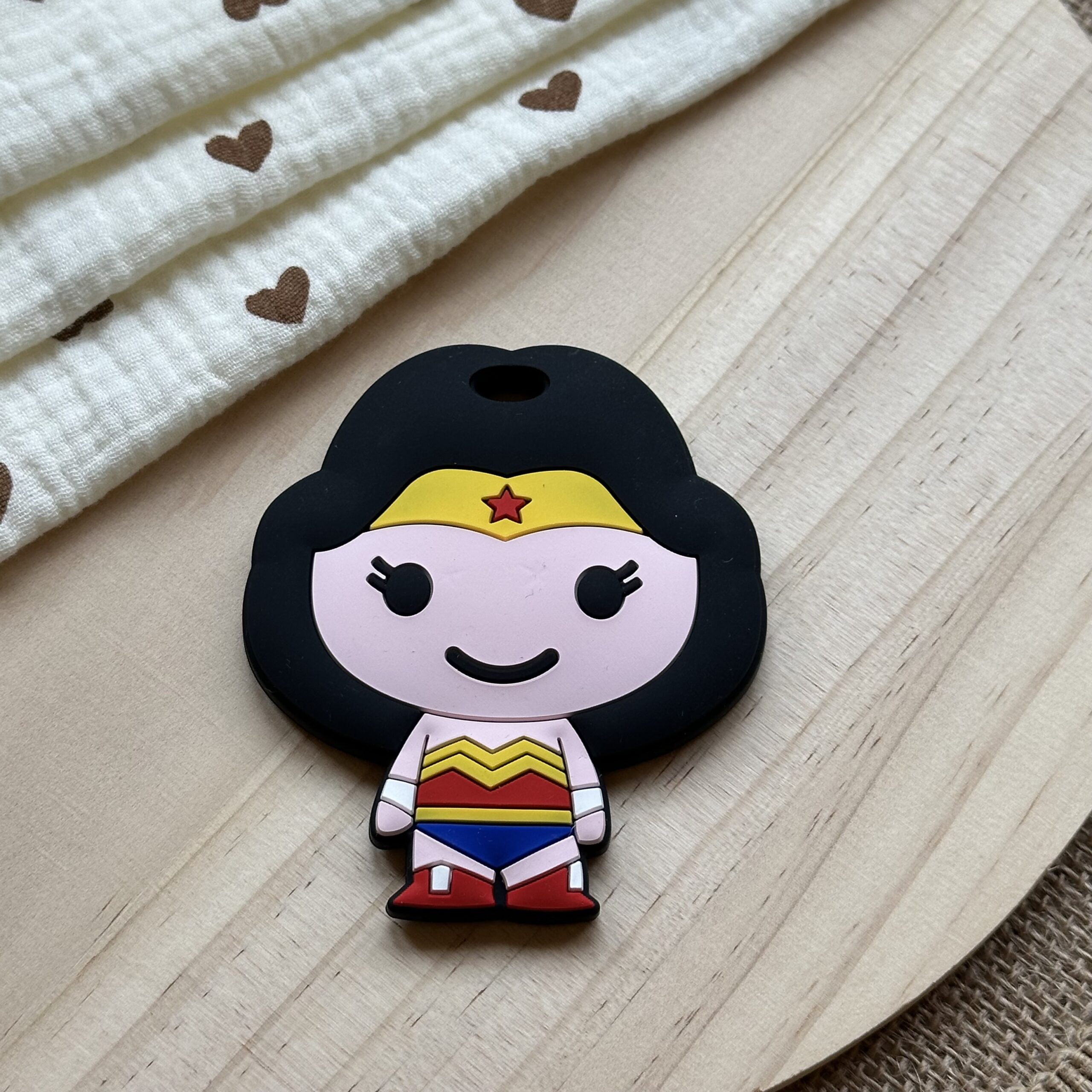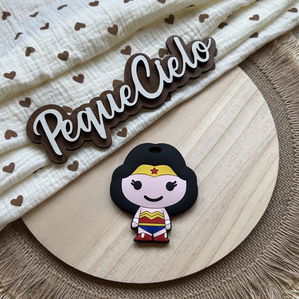 Este mordedor inspirado en Wonder Woman bebé combina poder y dulzura. Fabricado en silicona alimentaria, alivia las encías mientras acompaña a tu peque en sus primeros logros.