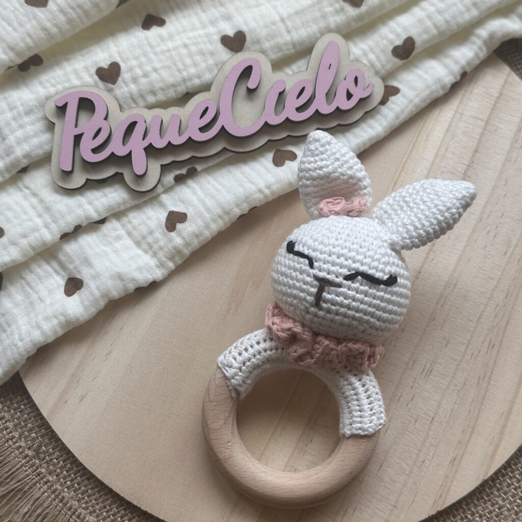 Esta dulce conejita de ganchillo no solo suena con suavidad, sino que también acompañará a tu bebé en sus primeras caricias, sonrisas y descubrimientos.